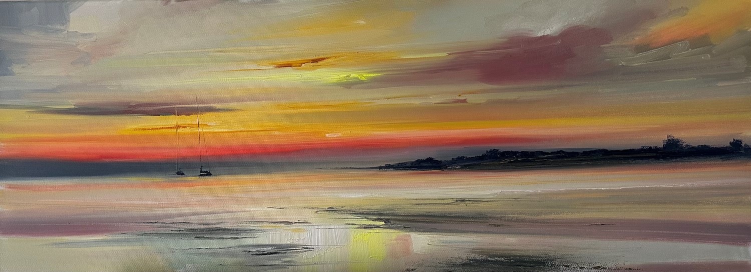 Heightened colours of sunrise, sunset, amidst calm and storm; simplified shape and blending lines are the basis of her distinctive abstract style.