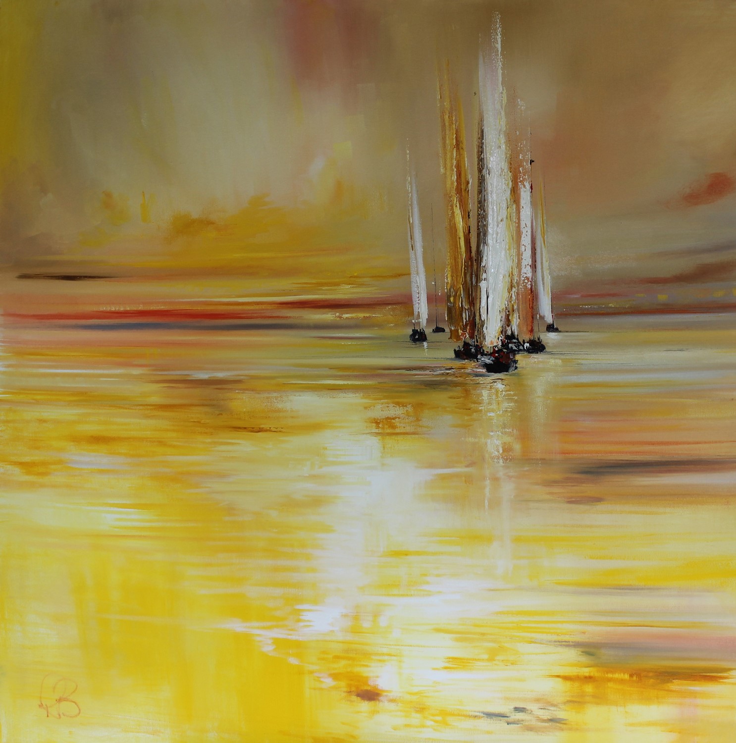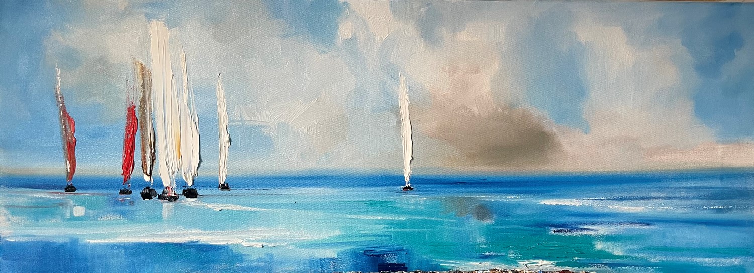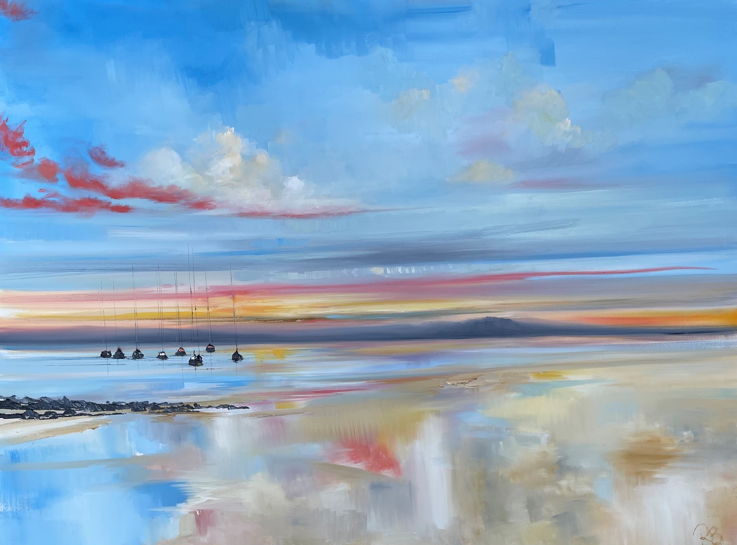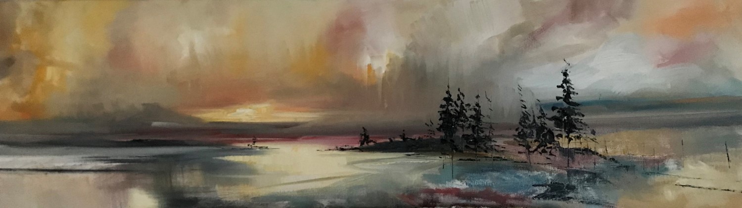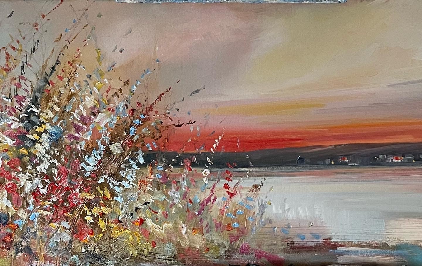 Heightened colours of sunrise, sunset, amidst calm and storm; simplified shape and blending lines are the basis of her distinctive abstract style.