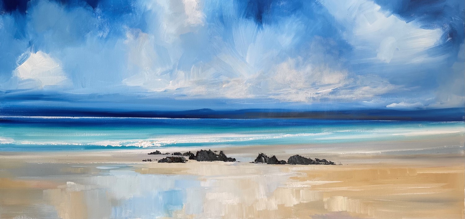 These are imagined places - her Lands of Escape - but based on direct experience of the Atlantic seaboard of North West Scotland and Orkney Orkney; real landscapes of hill-top, ocean and immense, free sky. Places she still visits with her young family.