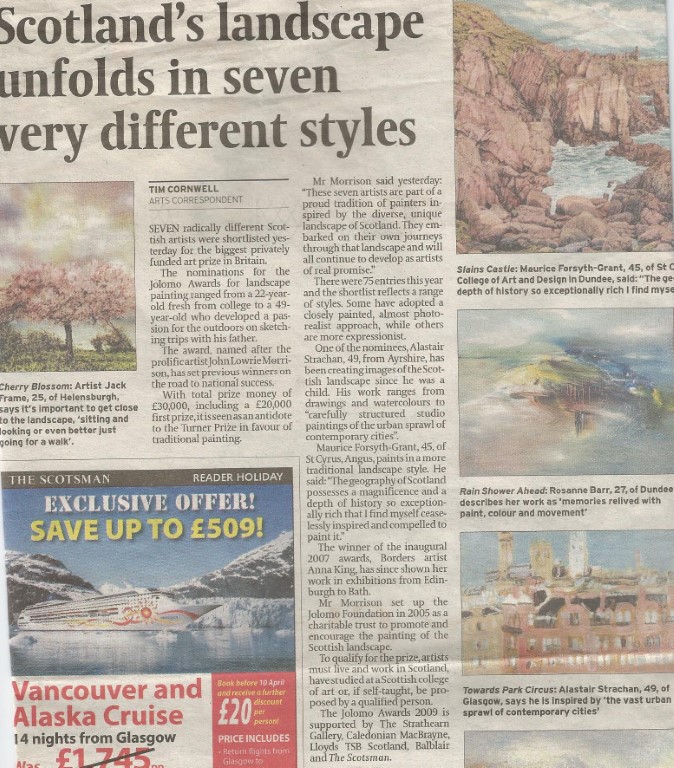 Article in Scotsman about the shortlisted of seven artist including myself for the Jolomo Awards 2009, Scotland's largest funded landscape painting prize.
