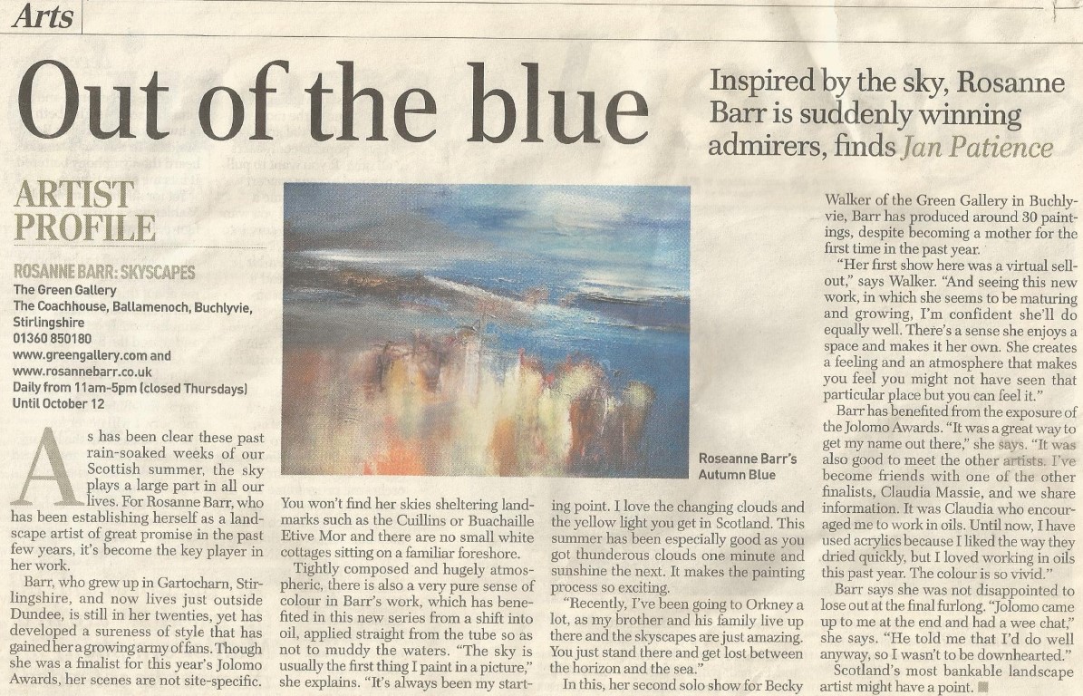 "As has been clear these past rain-soaked weeks of our Scottish summer, the sky plays a large part in all our lives. For Rosanne Barr, who has been establishing herself as a landscape artist of great promise in the past few years, it's become the key player in her work.